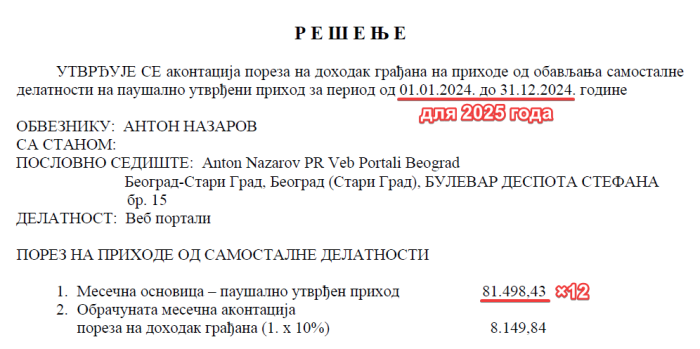 Базой для расчёта служит ваш годовой доход за прошлый календарный год, указанный в документе Решение о признании паушального налога (Rešenje o utvrđivanju poreza).